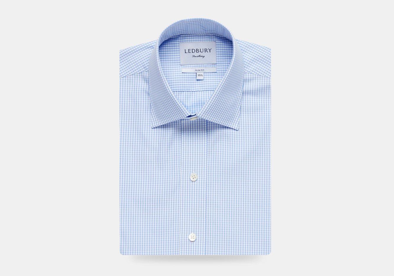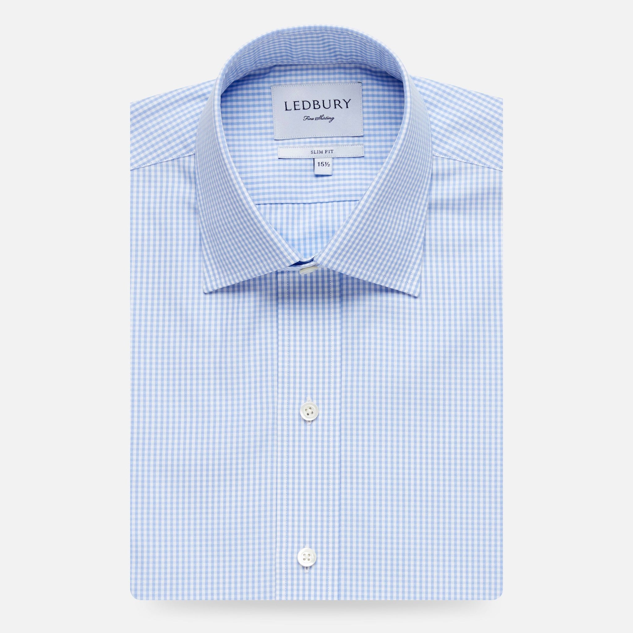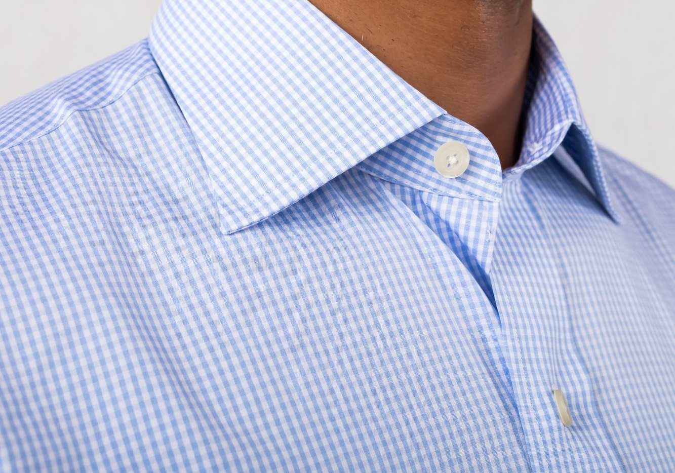 The ever versatile gingham. This small, blue and white micro-gingham check creates the ideal classic shirt that's a great fit for any occasion. Finished with a Mid-Spread collar. Tailored fit features a darted back.