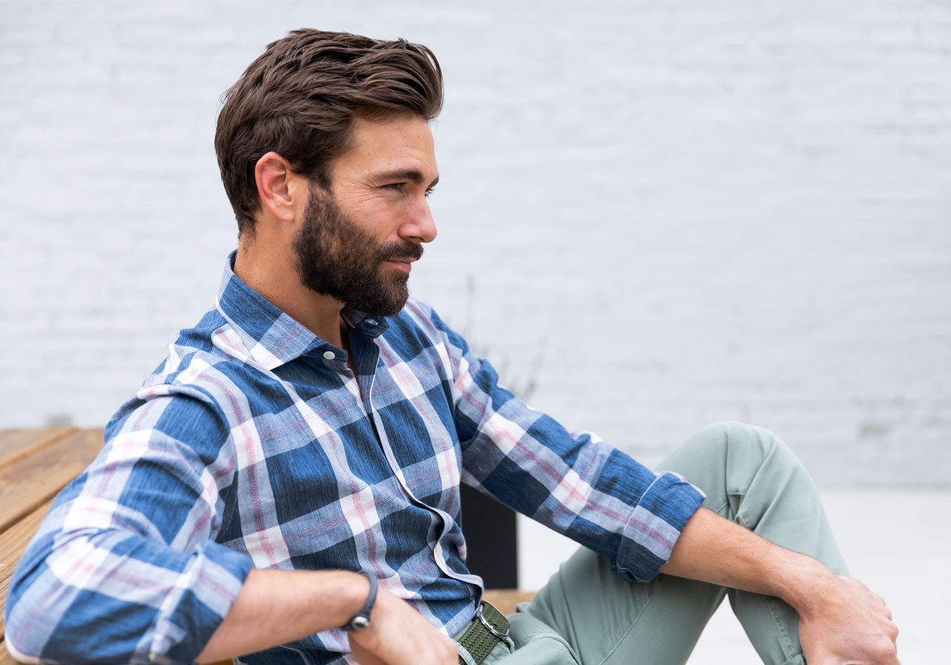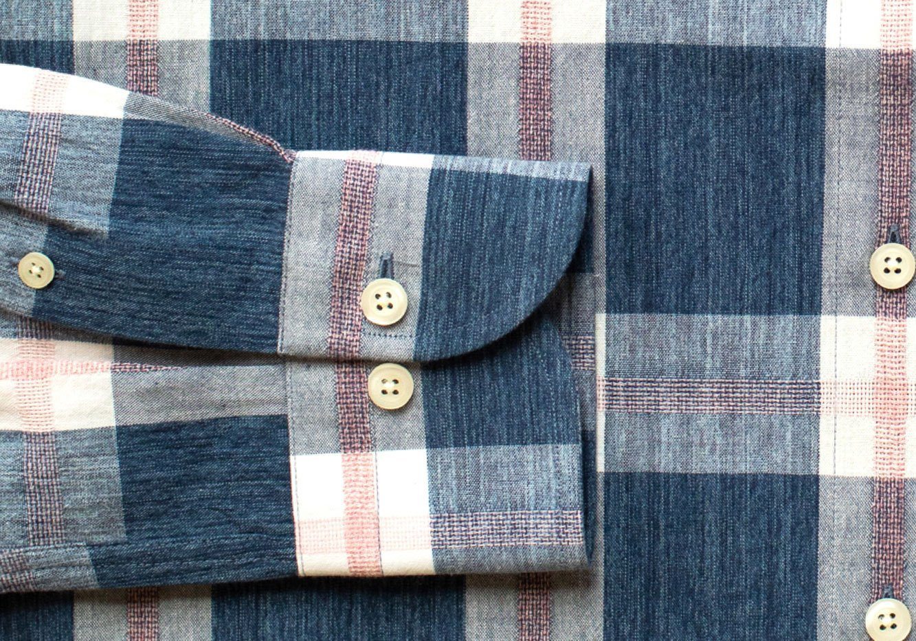 Constructed from 100% cotton from luxury Japanese mill, Kuwamara Co., this gauzy plaid is one of a kind. With a casual light blue and navy plaid, and a pink jacquard texture throughout, The Rawls plaid is an essential spring style.