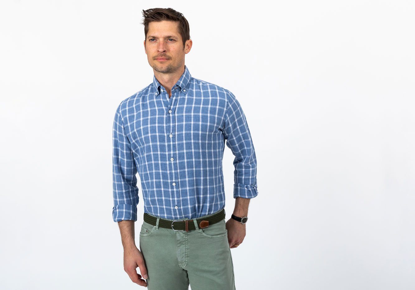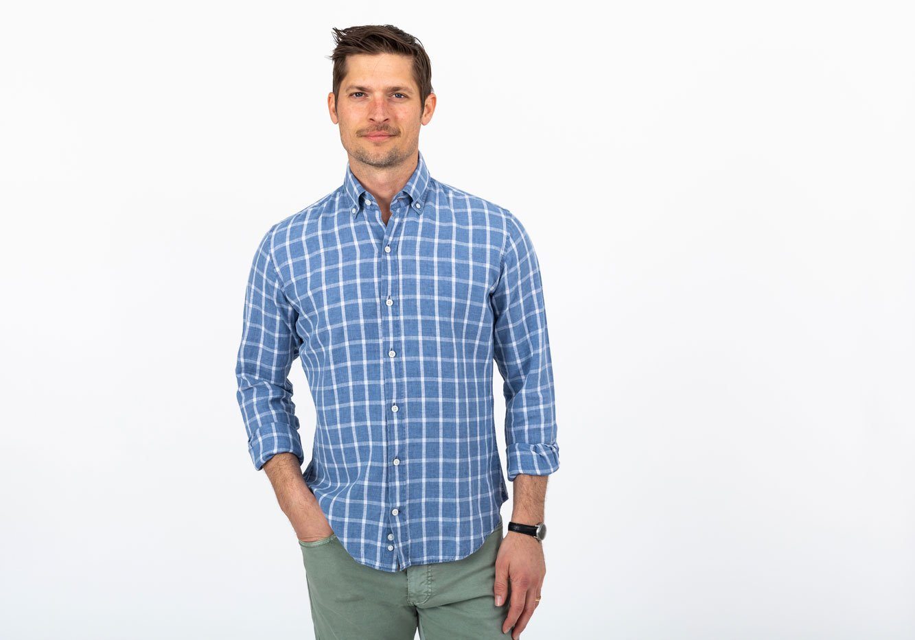Thanks to this style’s linen-cotton blend, the fabric remains breathable and gauzy like linen but retains the smoothness of cotton. This loosely woven plain weave is dyed using the delavé process, meaning the color will fade gently over time, lending to a broken-in, sun-faded look. Upgrade your casual shirts this season with a easy-wearing windowpane like The Rowan.