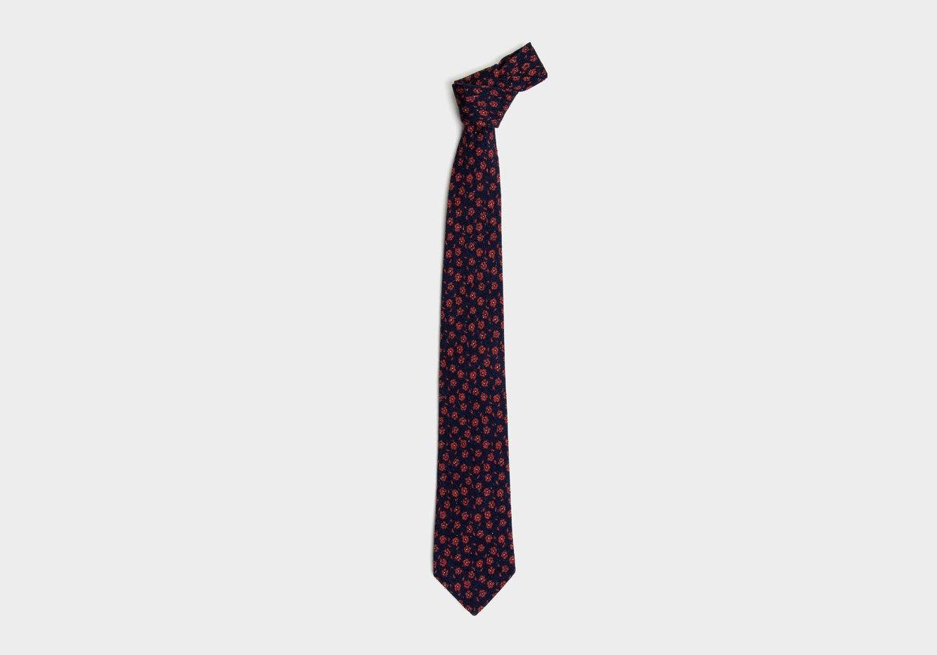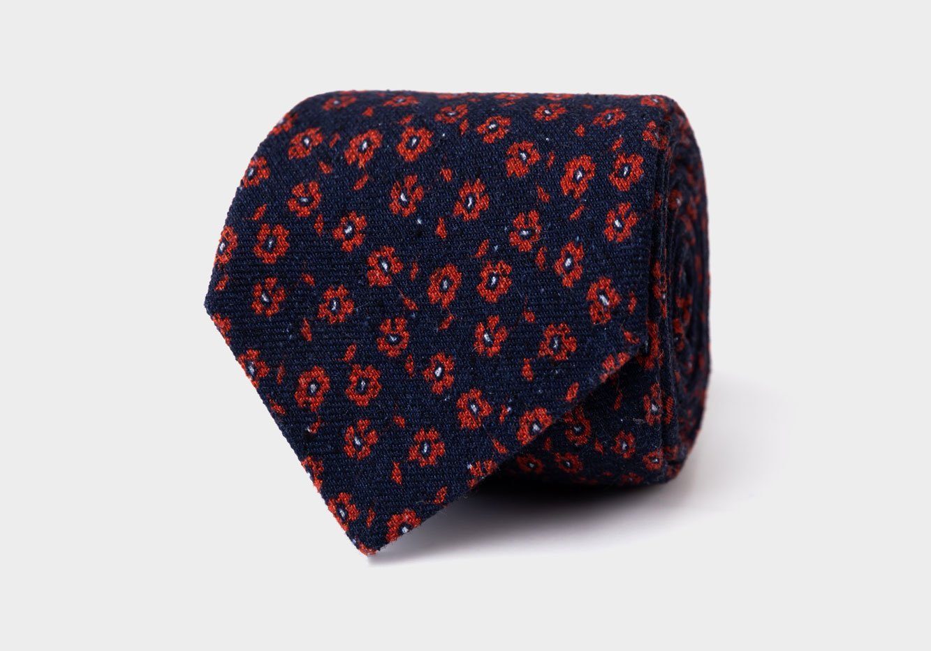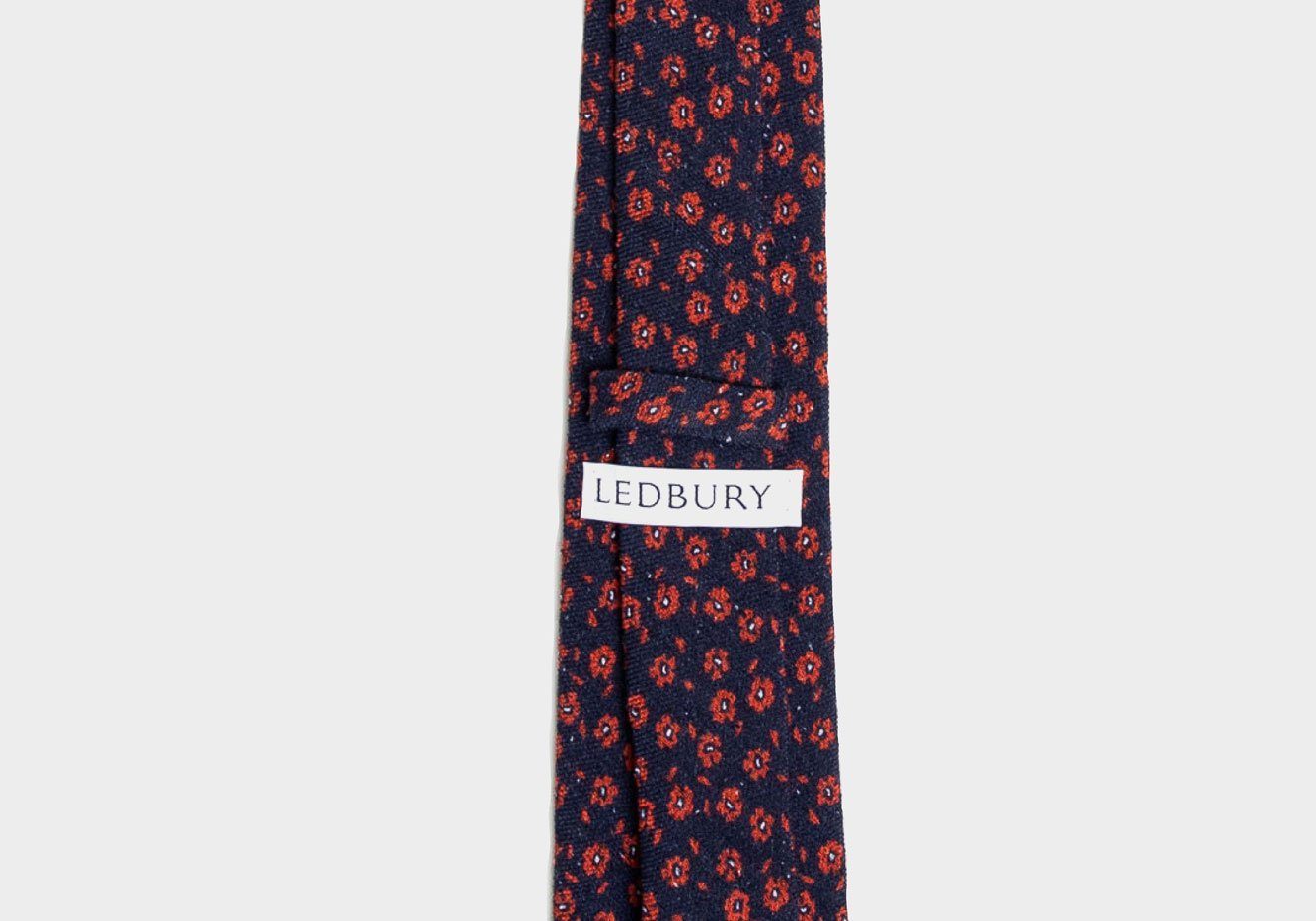 The Ansdell Tie is a navy tie with a red floral pattern and wooly texture. Sourced from Italy. Made in the USA.