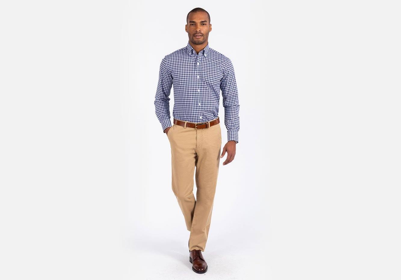 Who doesn’t like a blue gingham? This classic style comes in a crisp poplin construction perfect for year-round wear. Pair with a sweater and moleskin 5-pocket pants for an effortless holiday look.