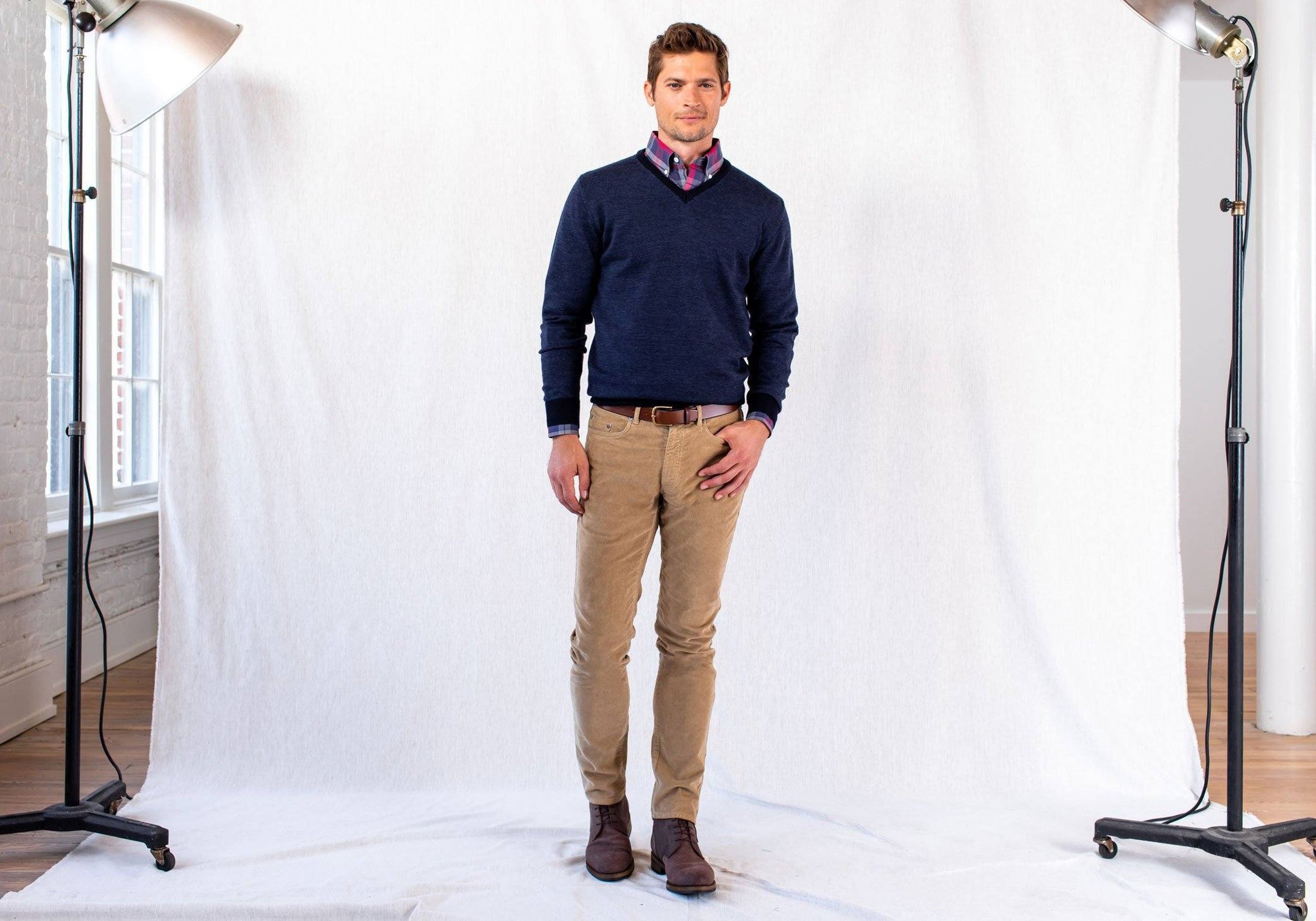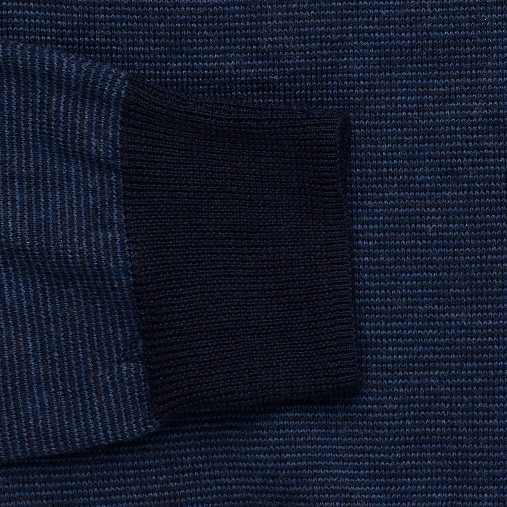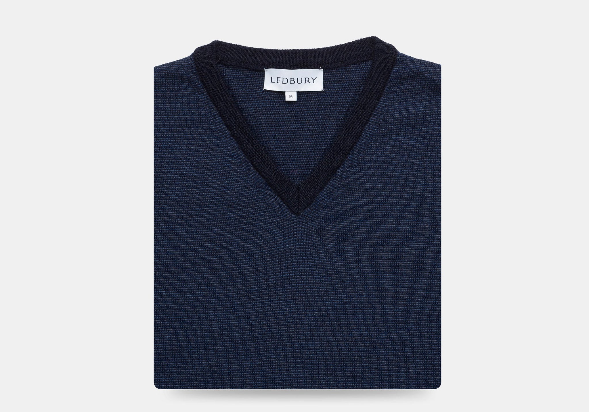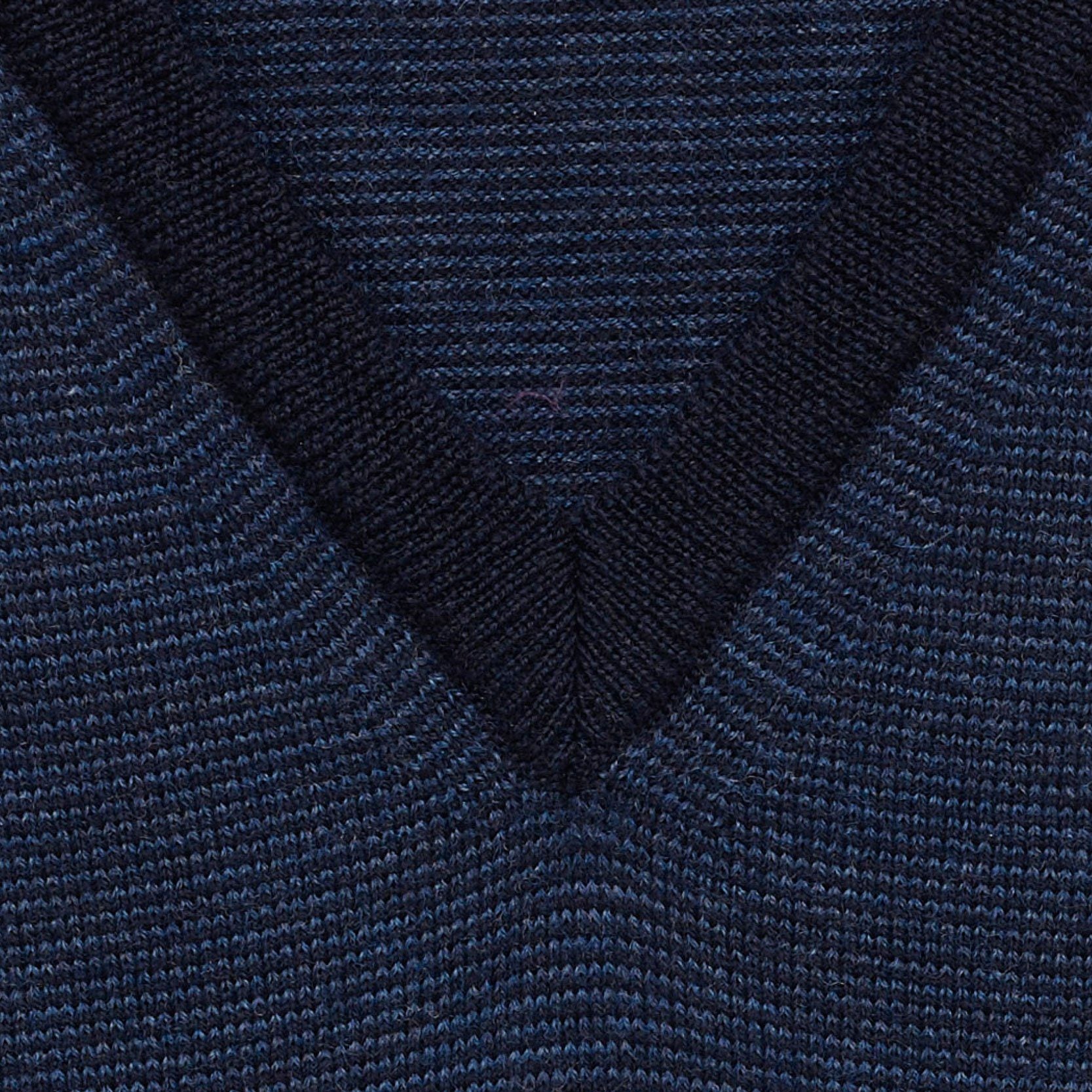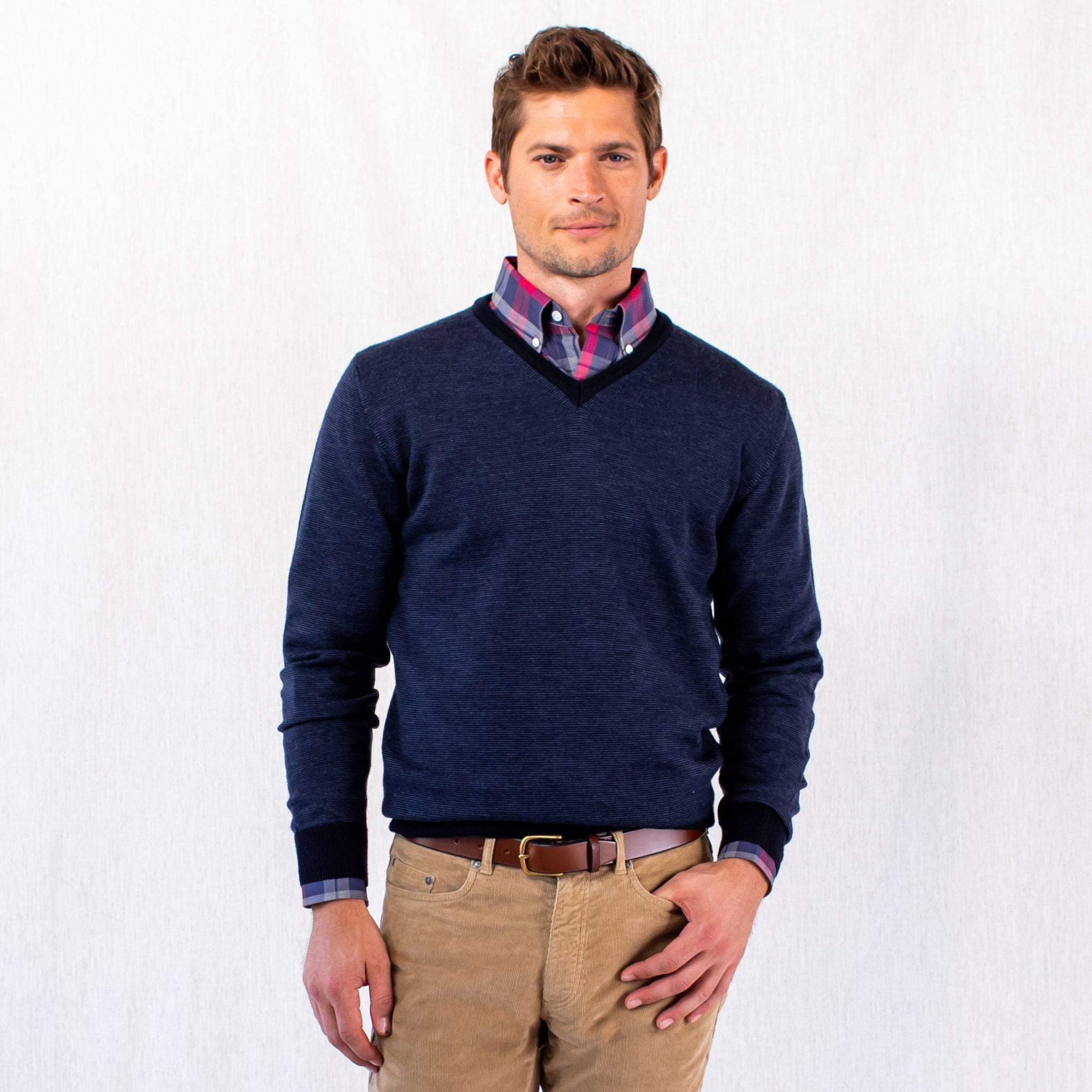 The Emmons Stripe V Neck Sweater is your new go-to for the colder months. This navy extrafine wool sweater features a knitted, striped pattern. This sweater was constructed from 100% extrafine wool, sourced from Italy, and has a soft and smooth handfeel. Detailed with rib knit trim, an elbow patch, and a v-neck that lays perfectly in line with our signature lowered second button, exposing just the right amount of pattern. Made in Italy.