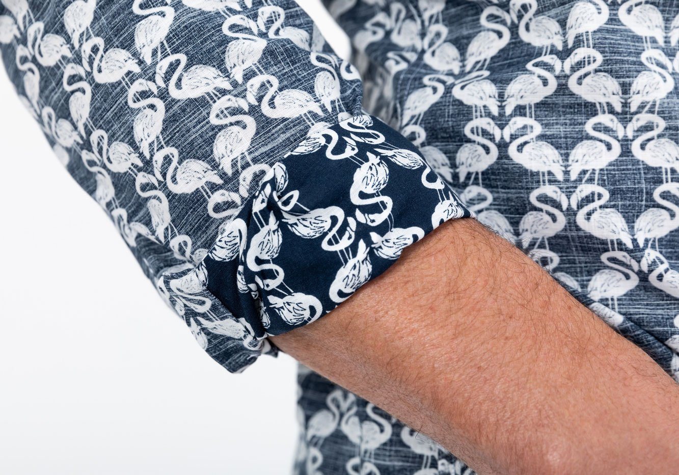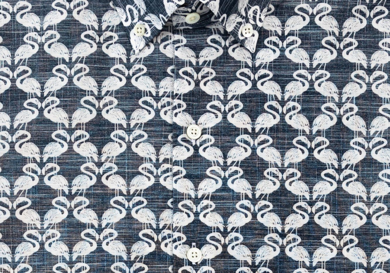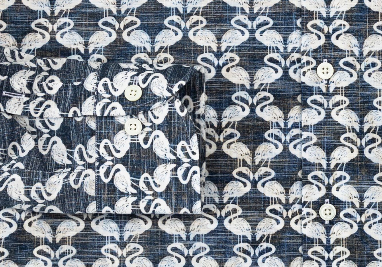 This fantastic fabric comes from the artisans at Albiate in Italy. Woven from 100% cotton, this weave is loose, gauzy, and lightweight—perfect for summer. Printed with a navy flamingo print, the outside of the shirt is actually the backside of this summery pattern, creating a negative-print appearance. For a casual and on-trend look that isn’t over the top, choose the Greenhaven.
