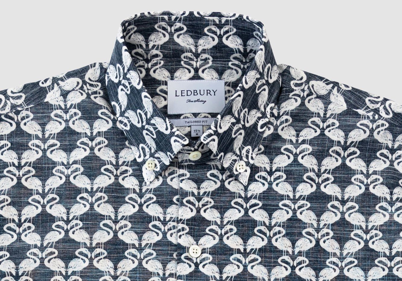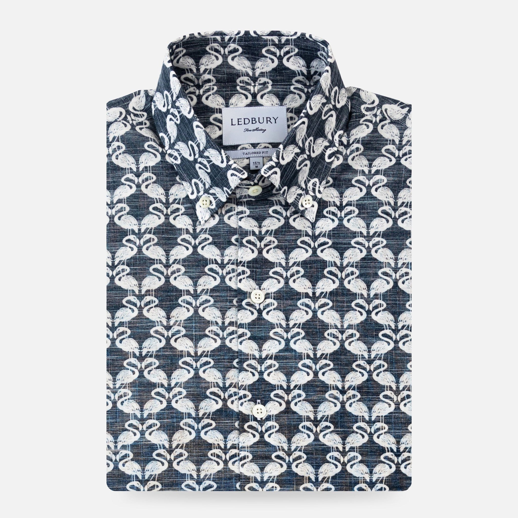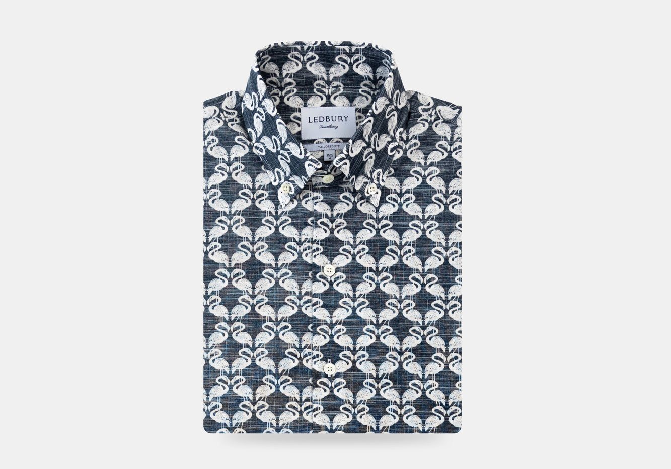 This fantastic fabric comes from the artisans at Albiate in Italy. Woven from 100% cotton, this weave is loose, gauzy, and lightweight—perfect for summer. Printed with a navy flamingo print, the outside of the shirt is actually the backside of this summery pattern, creating a negative-print appearance. For a casual and on-trend look that isn’t over the top, choose the Greenhaven.