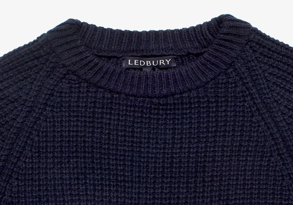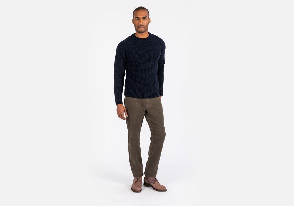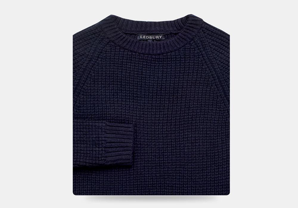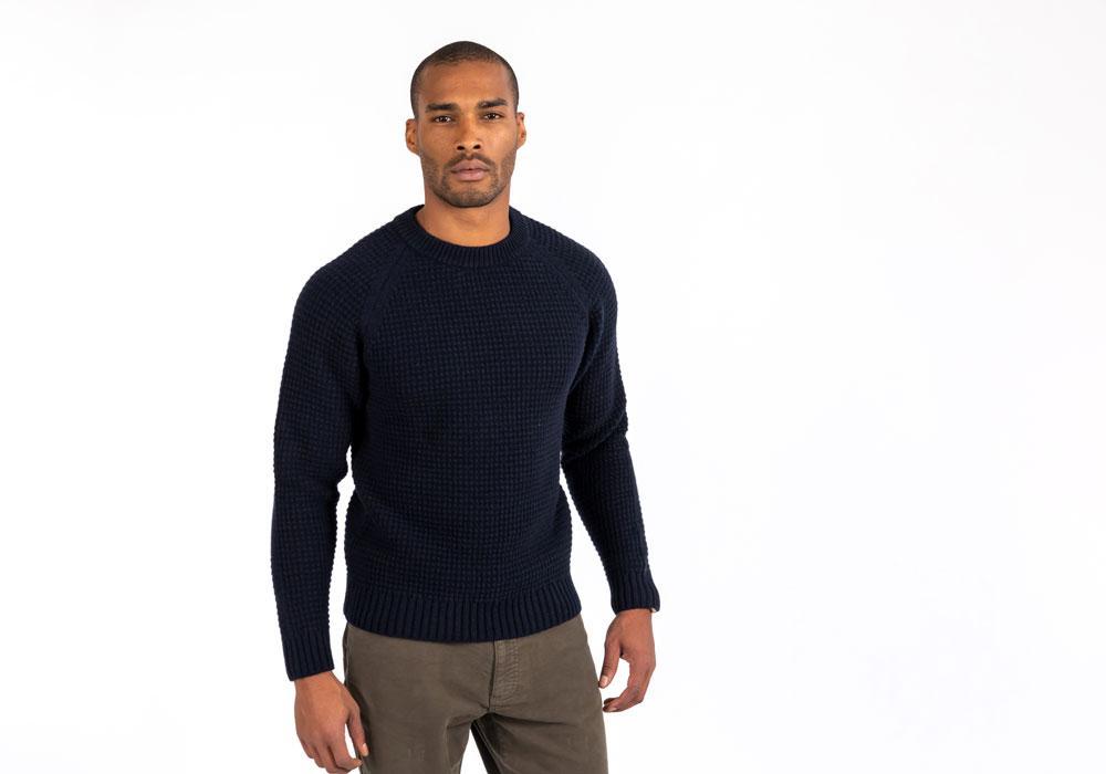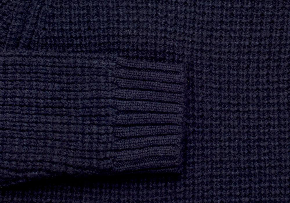 Our best-seller is back for another season. With a timeless thermal stitch in navy, this crewneck is a go-to style when the temperatures drop. Accented with contrasting elbow stitching and detail on the shoulder. Crafted with 100% lambswool. Made in Italy.