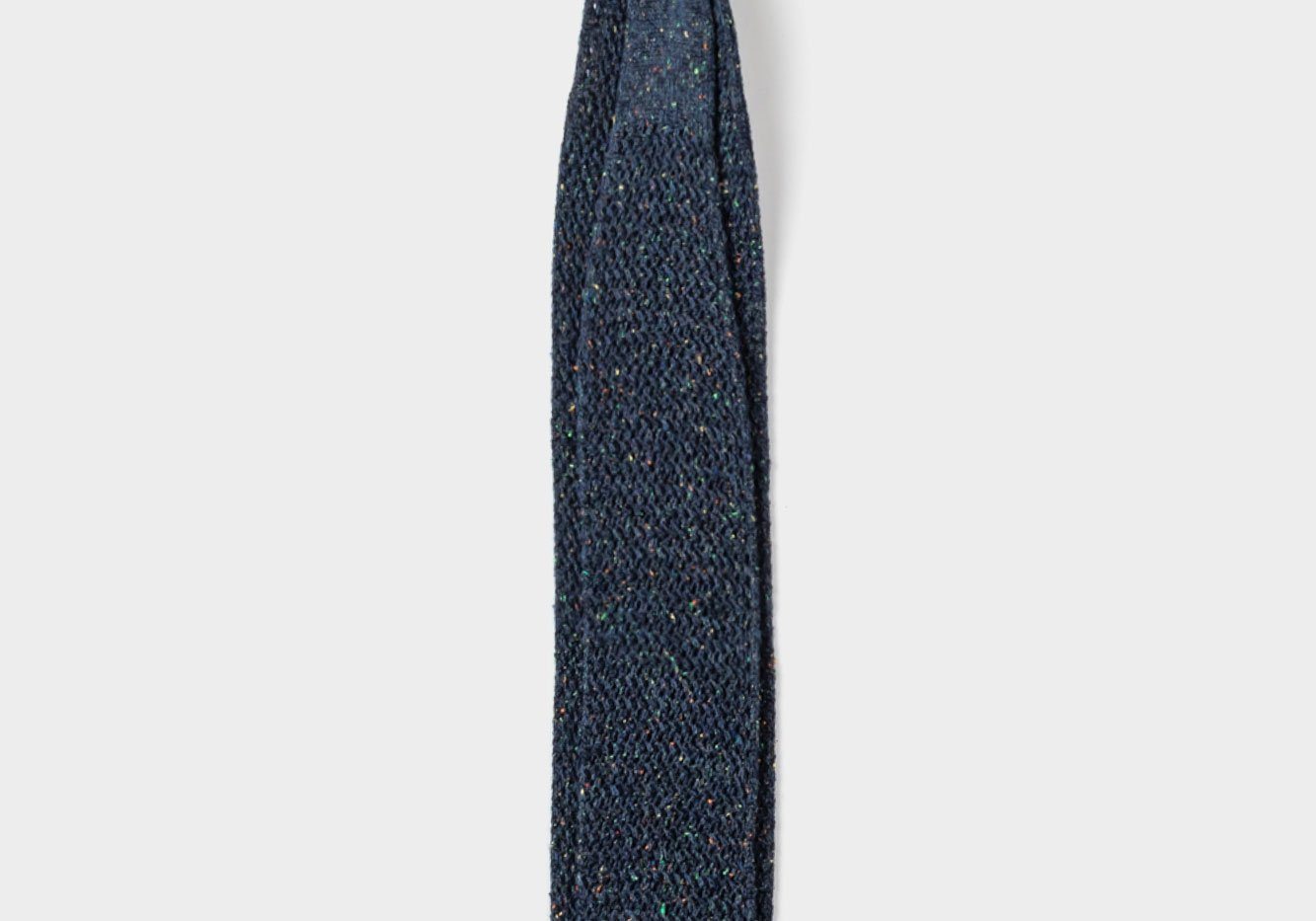 The Navy Wilshire Knit Tie is a navy and cool toned heather, open-knit tie with a square hem. The fabric around the neck is a soft and smooth knit for comfort. Sourced from Italy. Made in Italy.