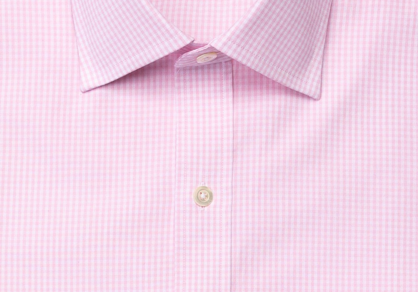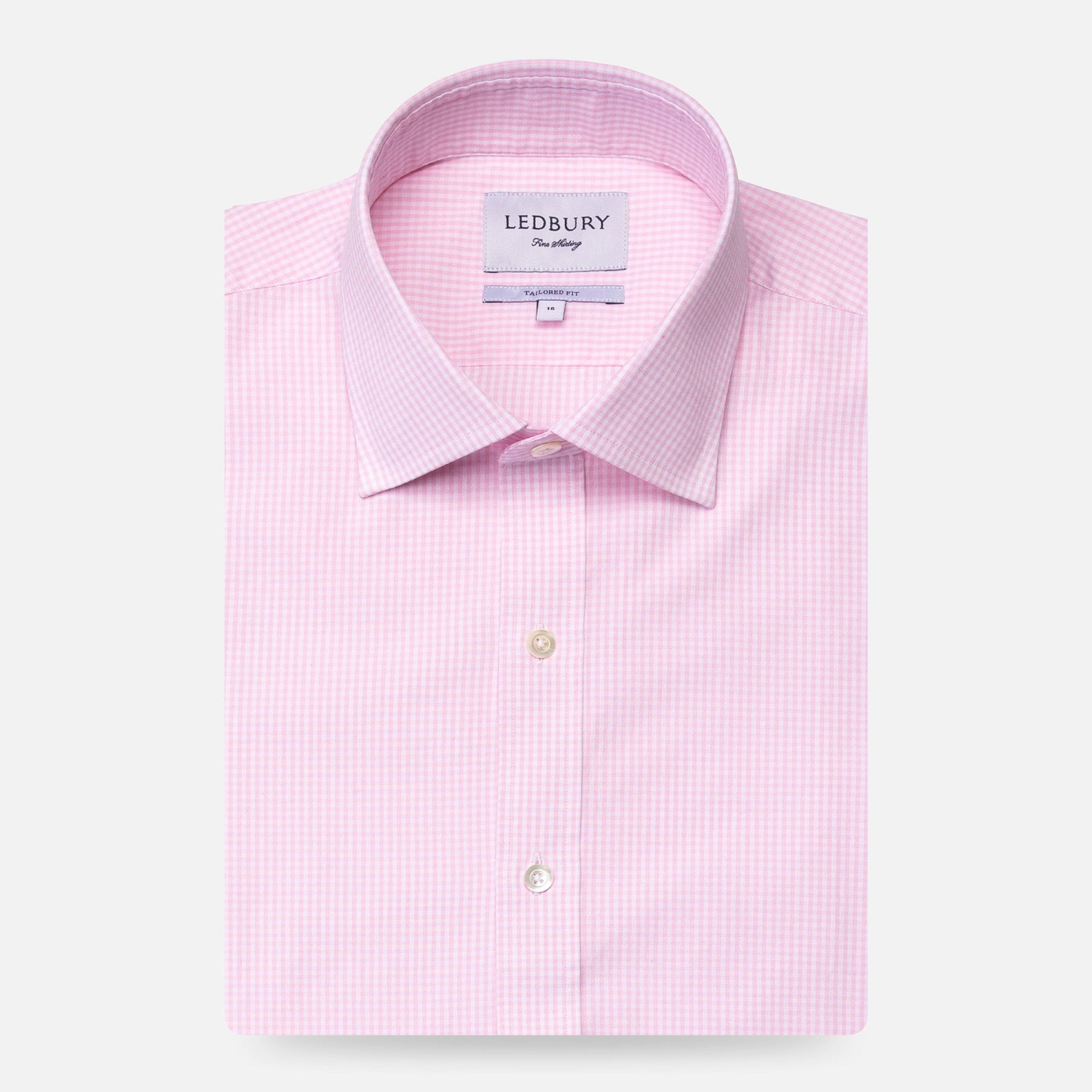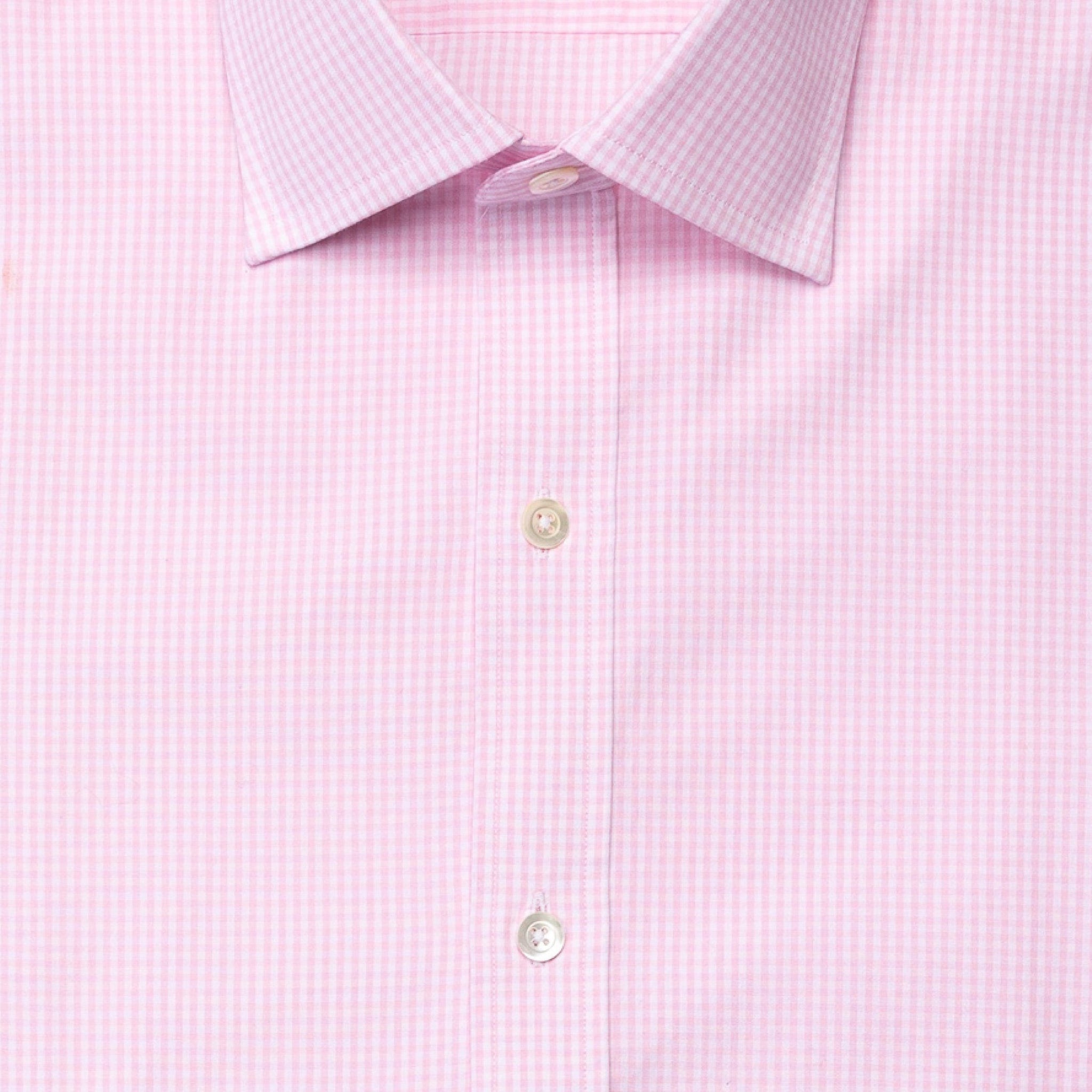 The ever versatile gingham. This small, light pink and white micro-gingham check creates the ideal pink shirt that's a great fit for any occasion. Finished with a Mid-Spread collar. Tailored fit features a darted back.