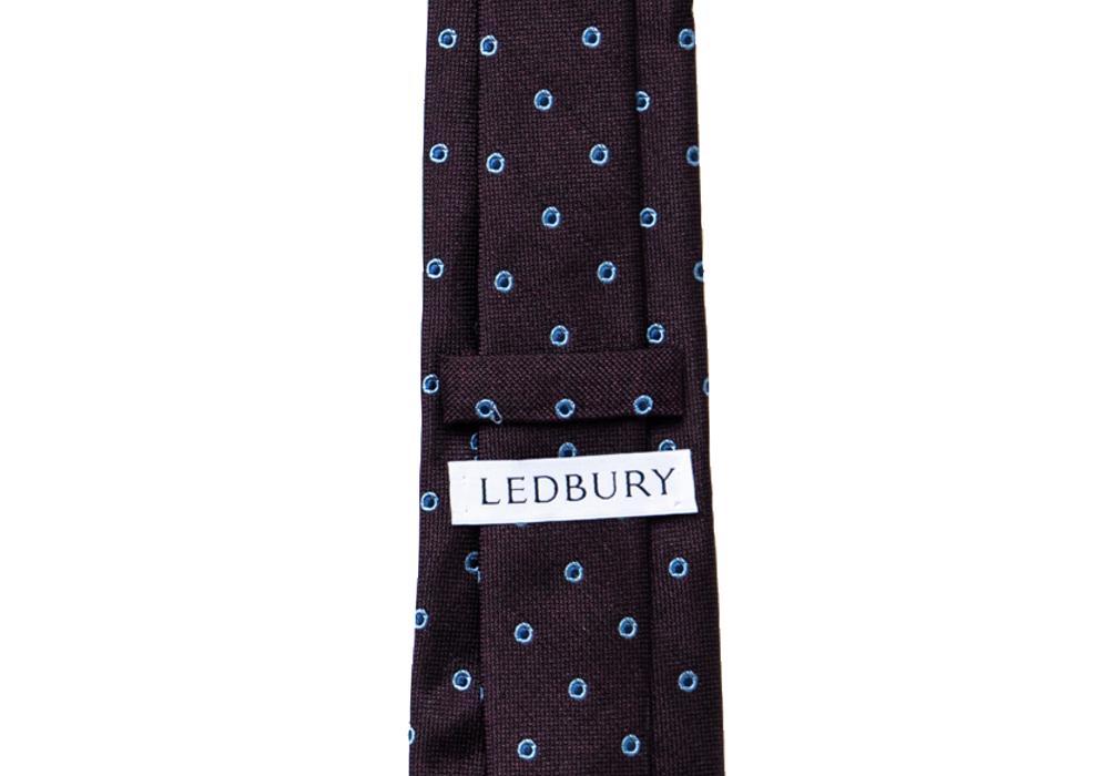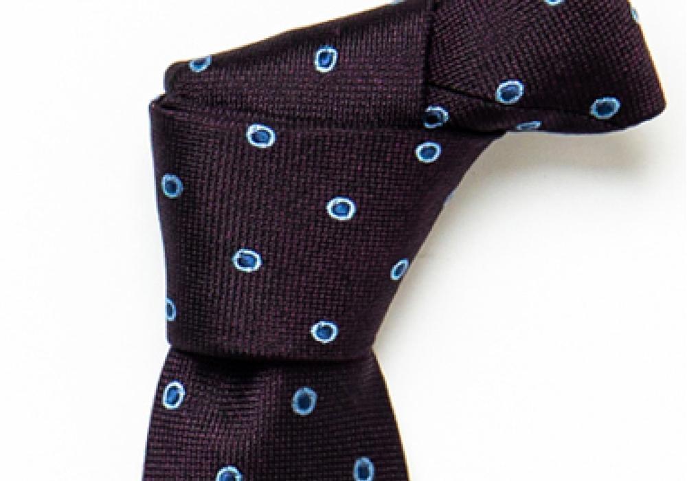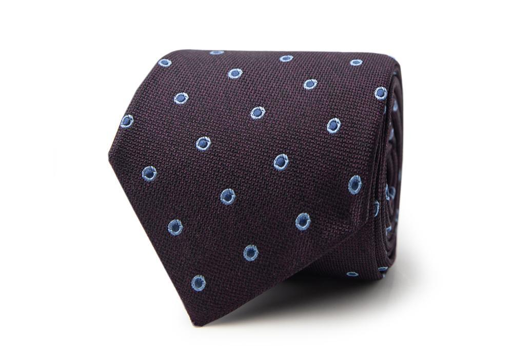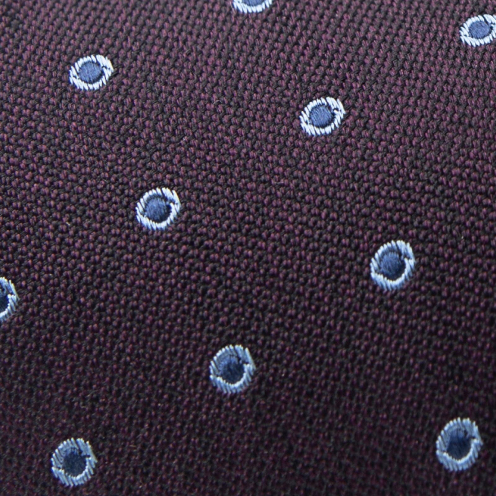 The Bateman Tie is a plum tie with a modern dot, woven pattern. Width is 3 inches and length is 58 inches. Constructed from 100% Silk, sourced from Italy. Made in the USA.