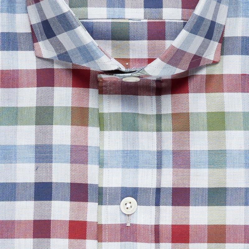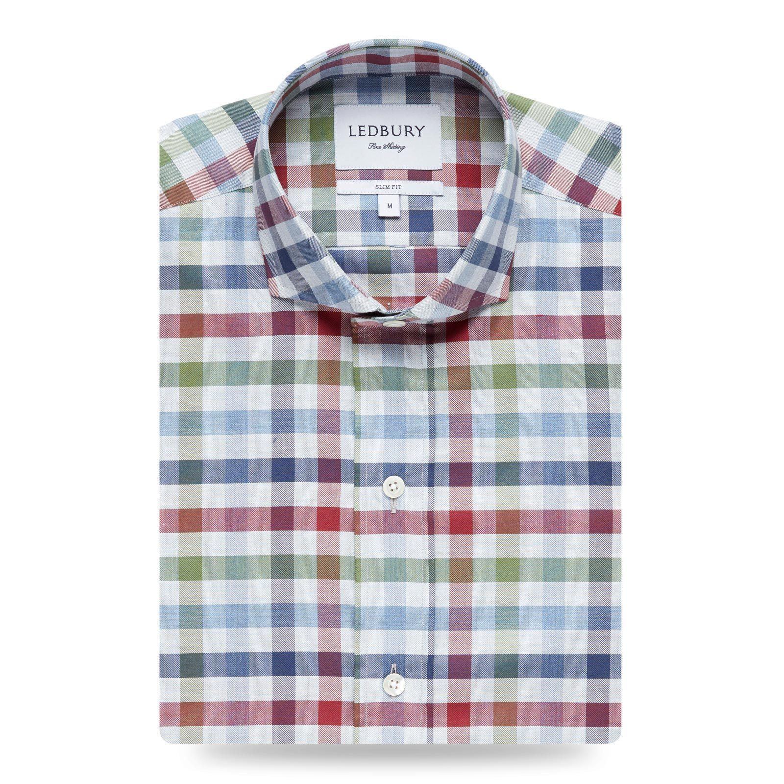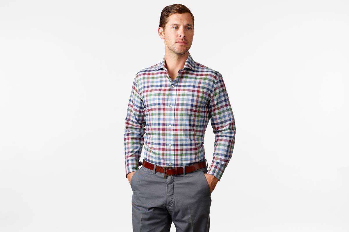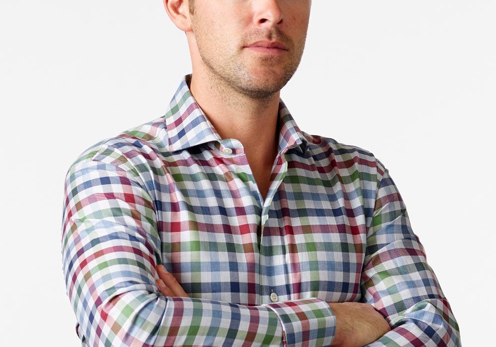 A multicolor gingham with tones of red, green, and blue on 100% cotton twill perfect for dressing up or down this season. Pair with your favorite sweater and 5-Pockets for a laid-back weekend look or layer under our Navy Wellington for a day at the office. Finished with an alden collar and a shortened body, allowing the shirt to be worn tucked or untucked. Available in slim and classic, sizes S-XXL.