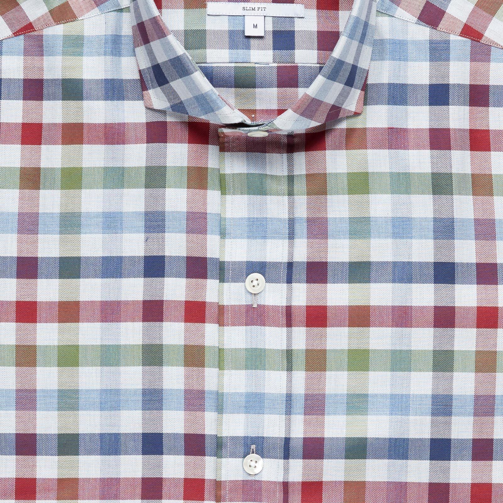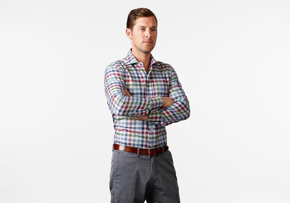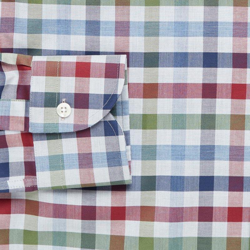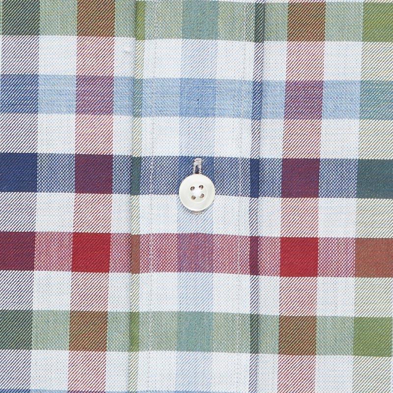 A multicolor gingham with tones of red, green, and blue on 100% cotton twill perfect for dressing up or down this season. Pair with your favorite sweater and 5-Pockets for a laid-back weekend look or layer under our Navy Wellington for a day at the office. Finished with an alden collar and a shortened body, allowing the shirt to be worn tucked or untucked. Available in slim and classic, sizes S-XXL.
