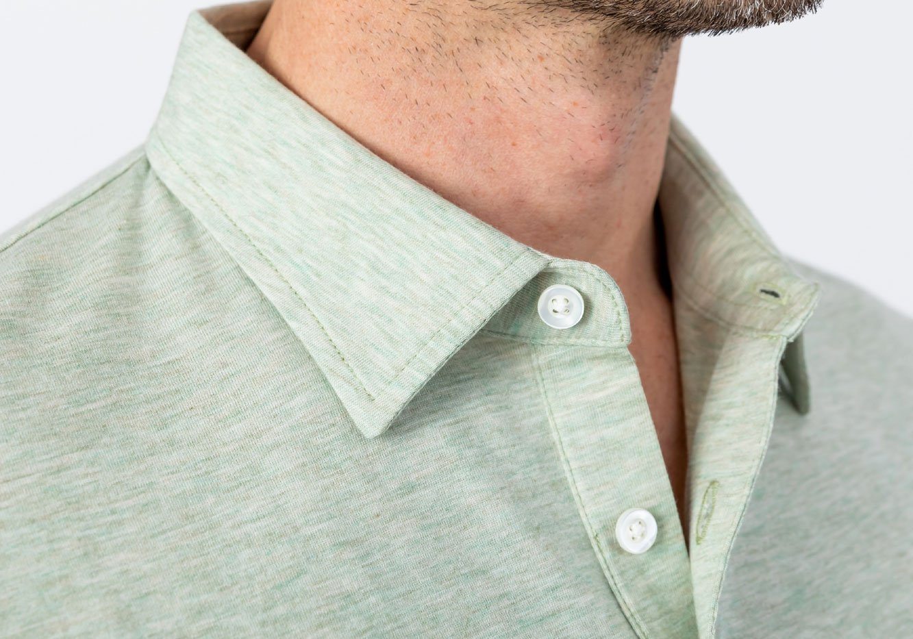 This sage polo is ready for summer. An ultra-soft, cotton/silk blend comes in a jersey knit to keep you cool and comfortable. Accented with a chest pocket and a heather knit, lending visual interest and a casual look.