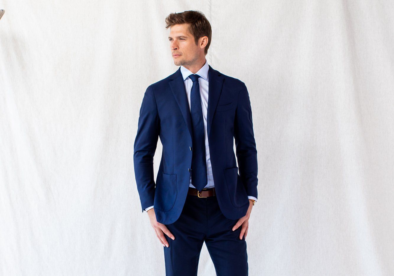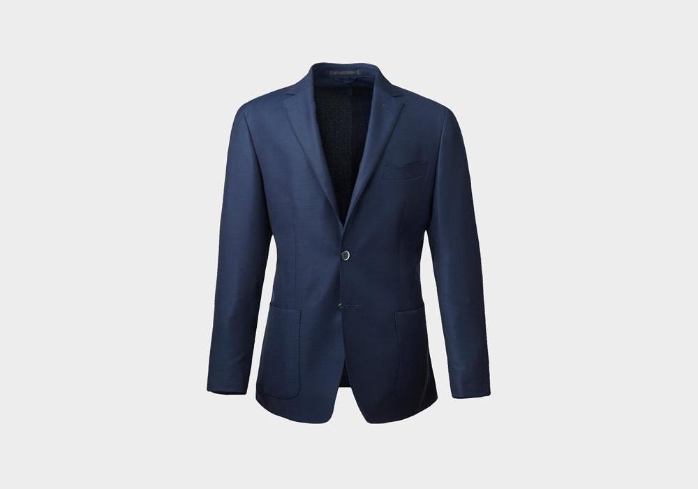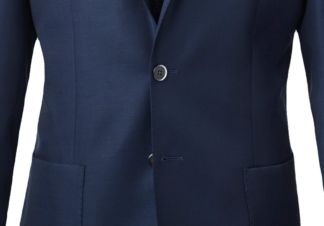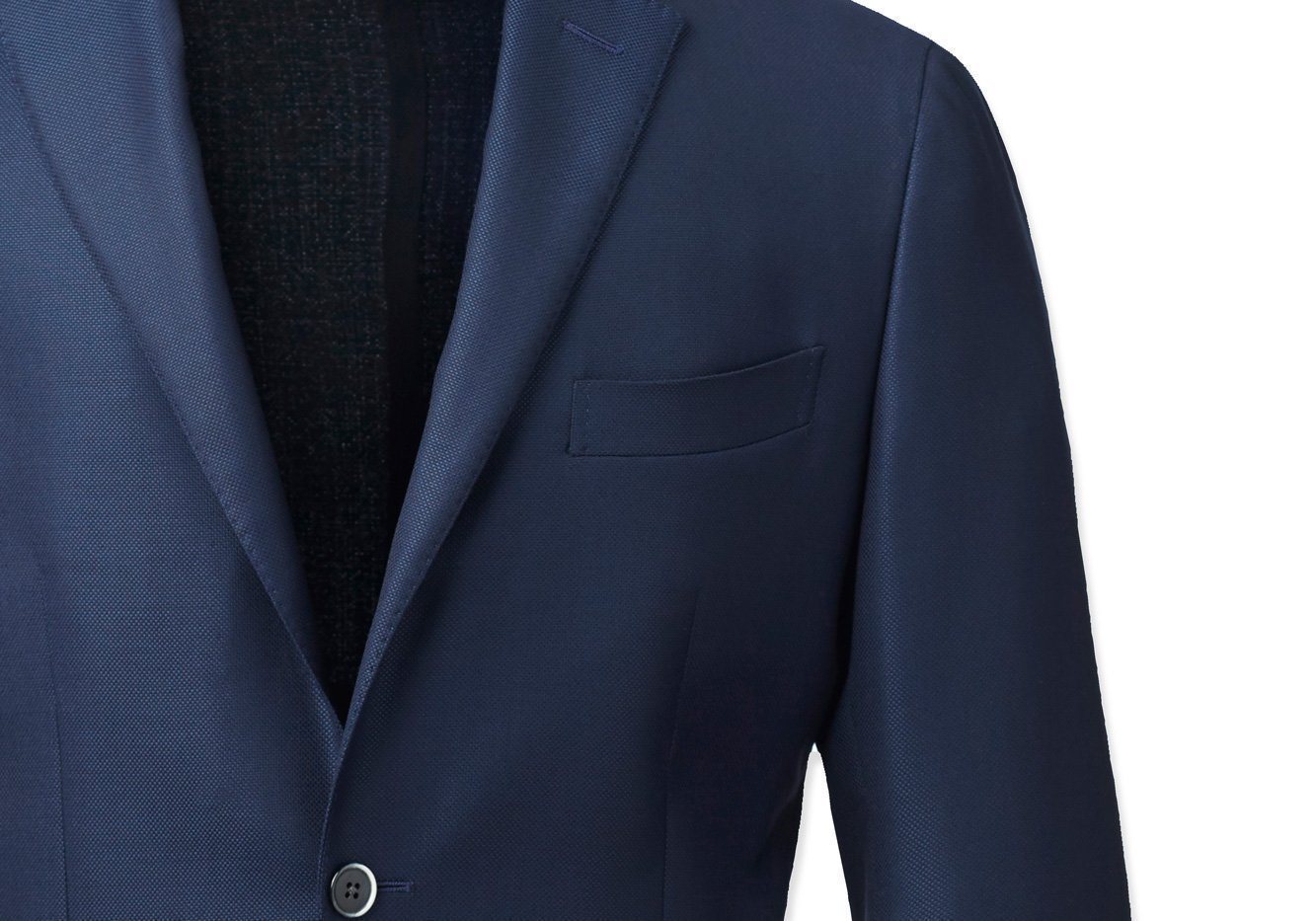 This super fine virgin wool sport coat is a beautiful deep navy blue hopsack weave. This Slim Fit Wellington is unlined to offer breathability during warmer seasons and is finished with double vents, two patch pockets, and a welt pocket on the left chest.
