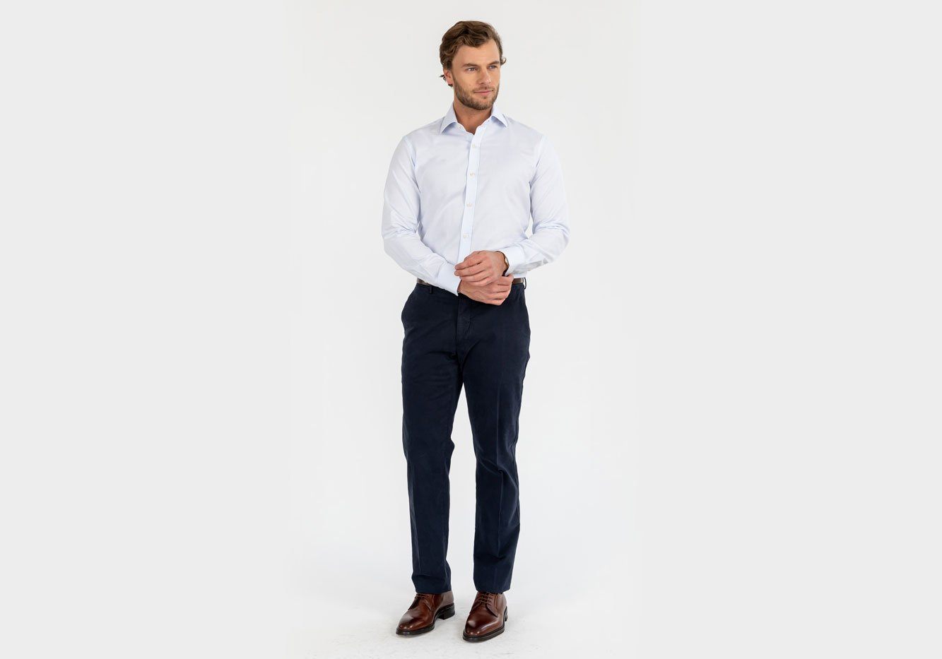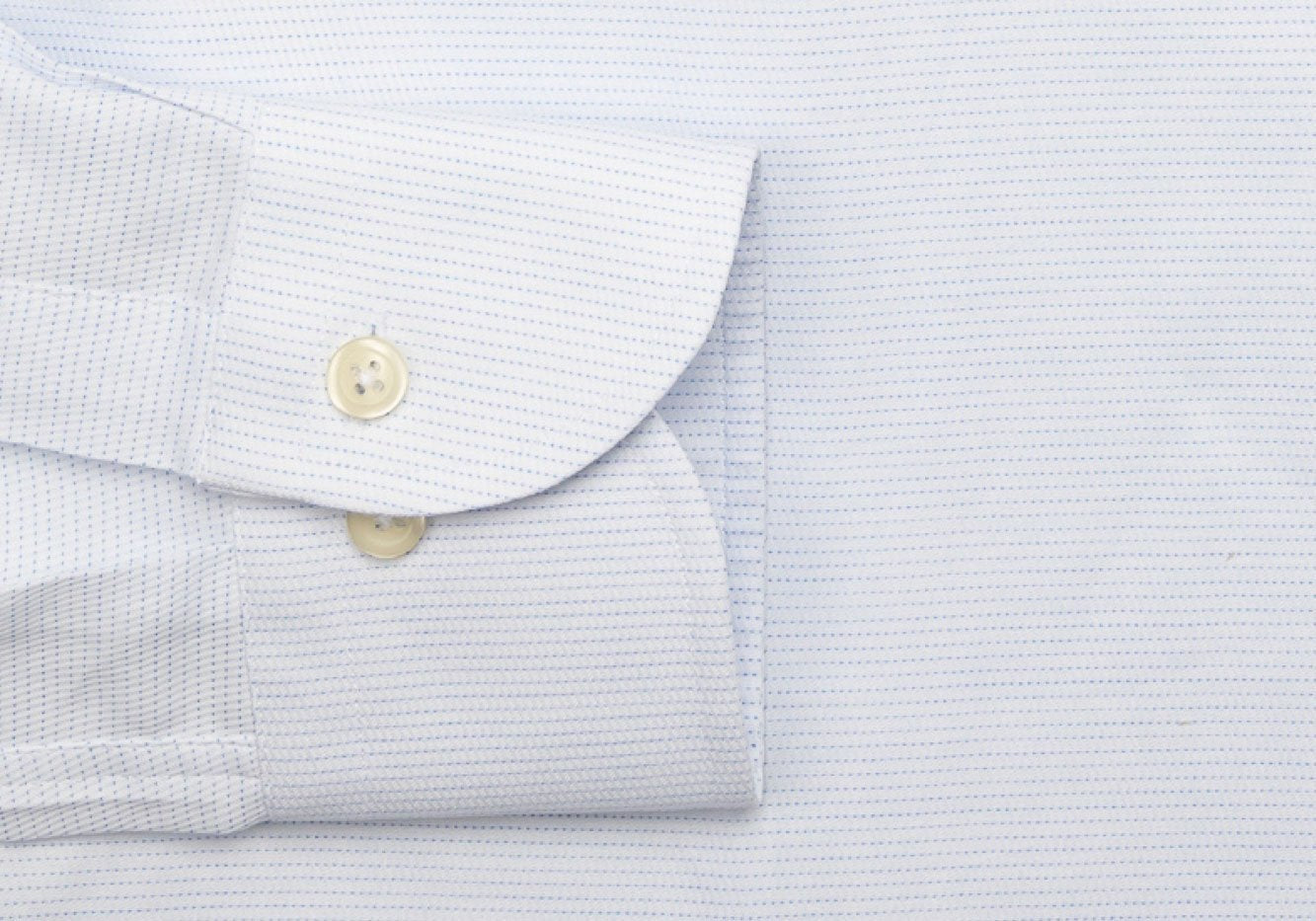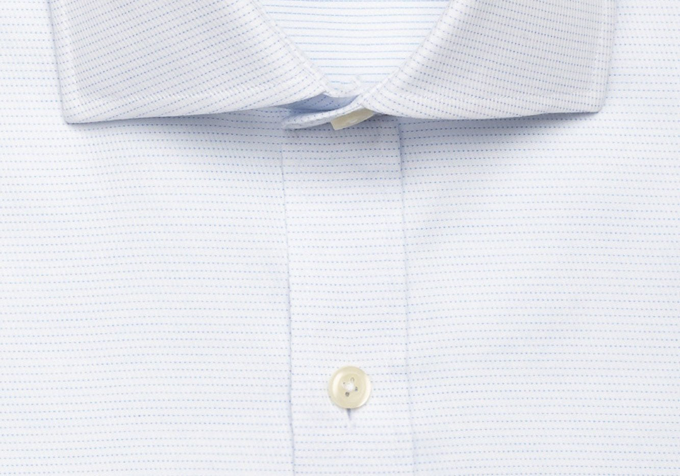 Leave your oxford shirt at home this time around. Instead, consider this unique dobby weave. The blue thread checks in and out of the foreground of the fabric to create a ticking stripe. This versatile business fabric comes from Spanish mill Sidogras.
