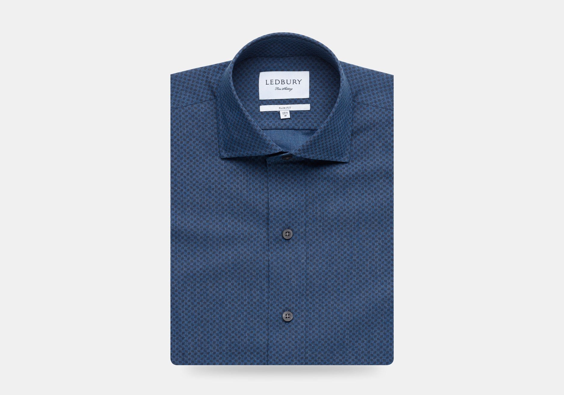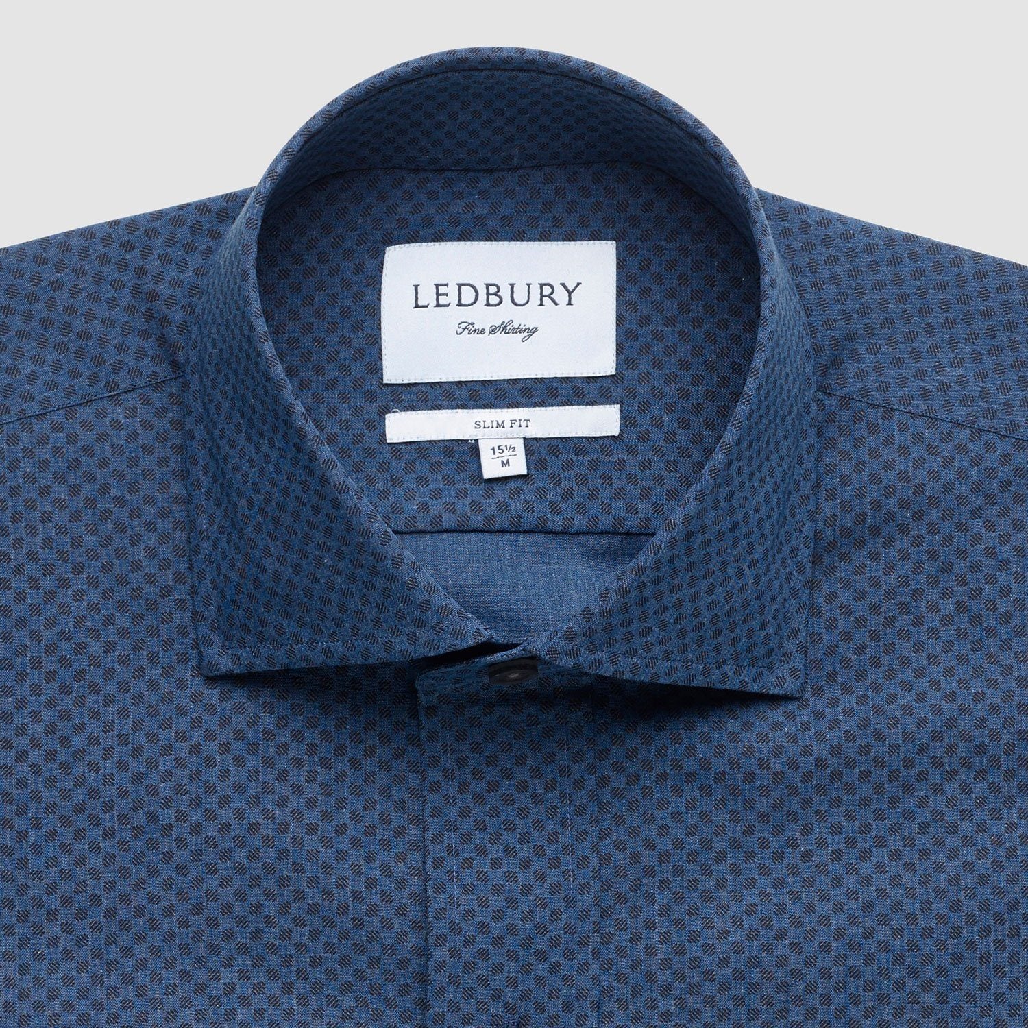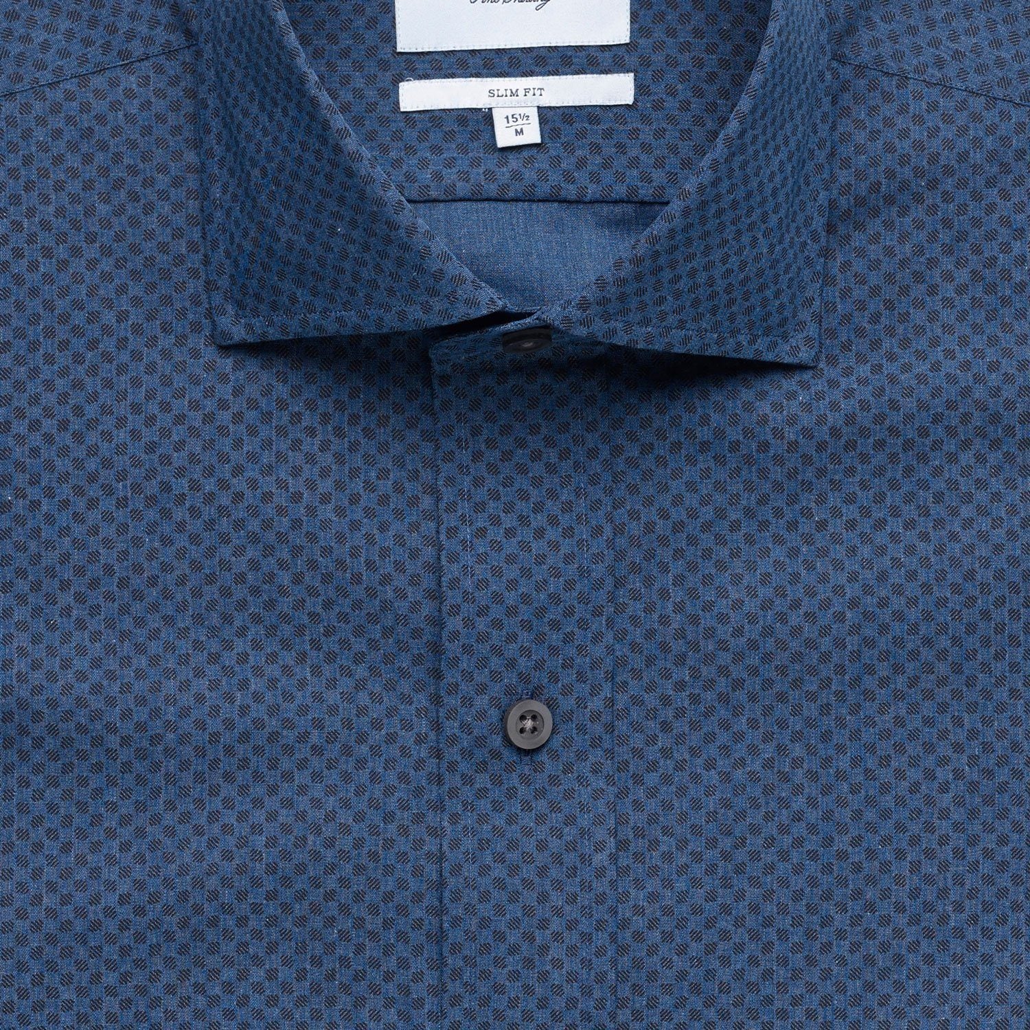 The Winhall Print Dress Shirt features a dark blue, melange heathered base fabric and a black, geometric micro pattern. Pair with your favorite sport coat for an elevated look. Constructed from 100% cotton, sourced from luxury Spanish mill, Sidogras. Features a Ledbury Spread collar and double-barrel cuffs with reinforced buttons. Tailored fit features a darted back for a more tailored fit around the torso.