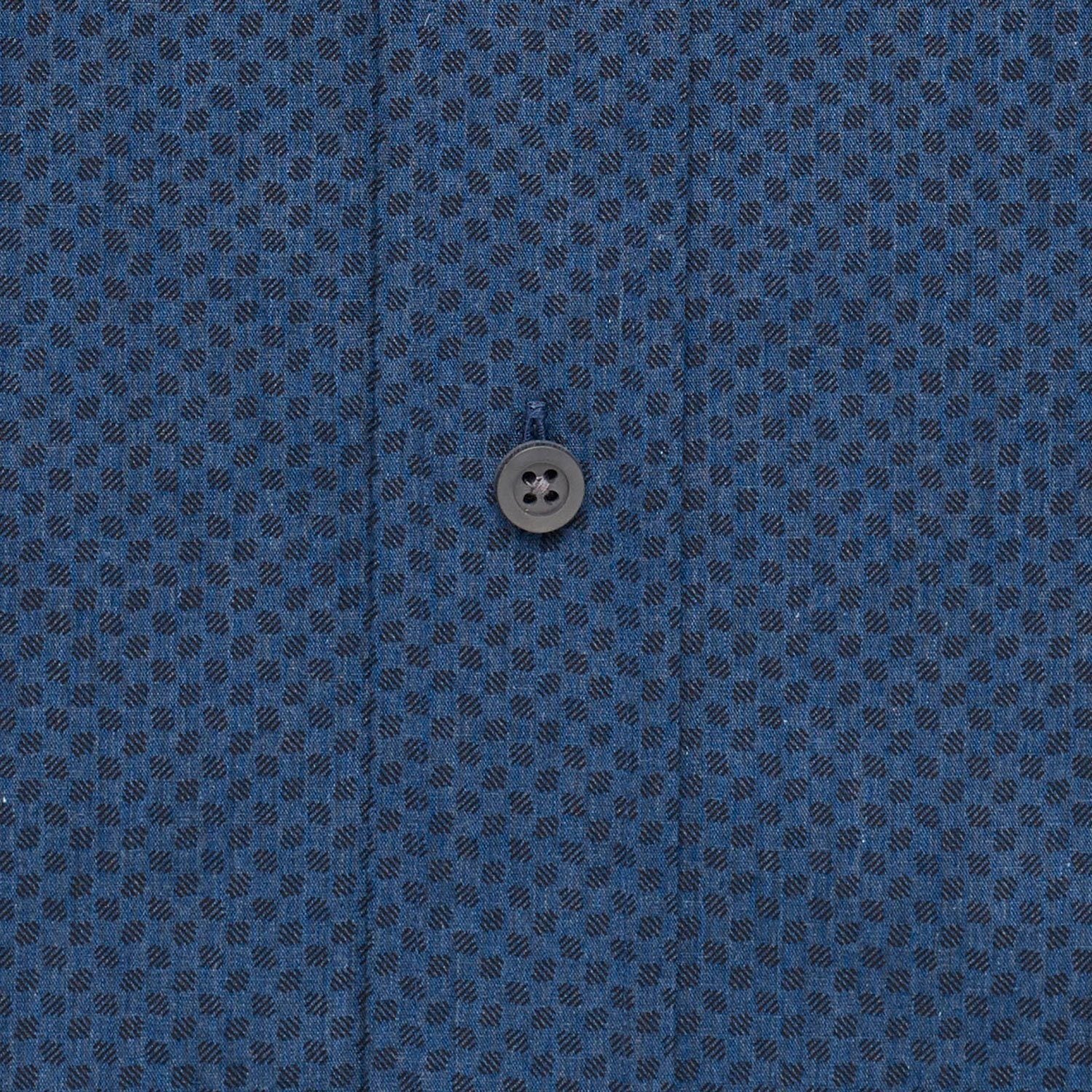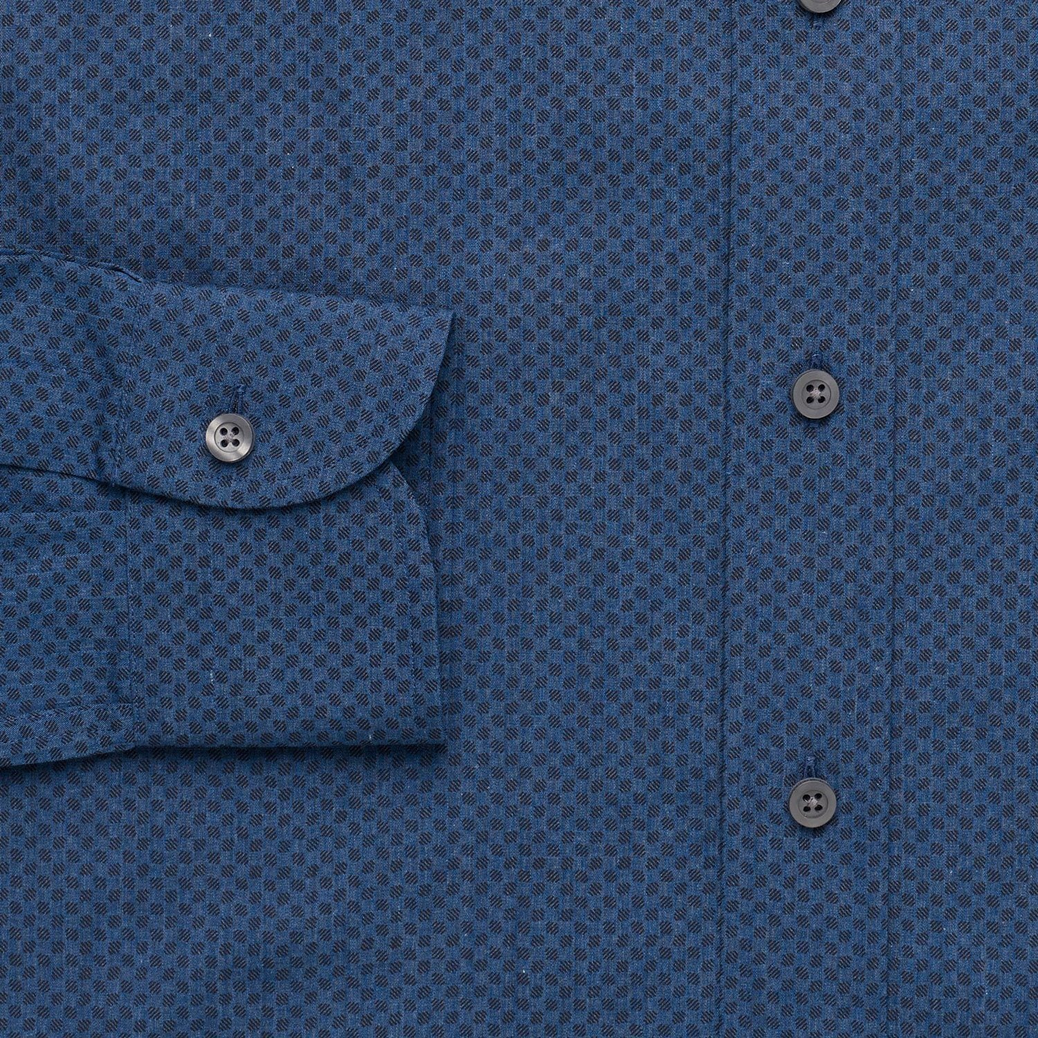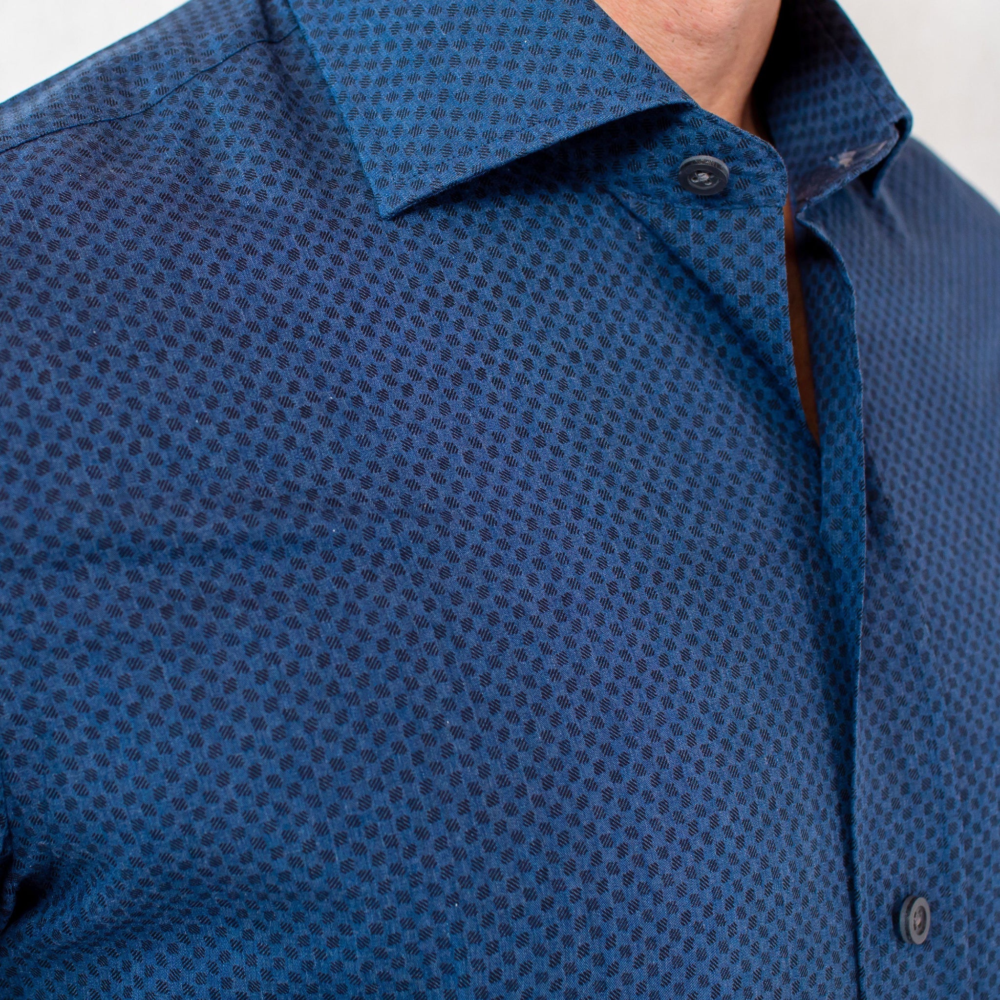 The Winhall Print Dress Shirt features a dark blue, melange heathered base fabric and a black, geometric micro pattern. Pair with your favorite sport coat for an elevated look. Constructed from 100% cotton, sourced from luxury Spanish mill, Sidogras. Features a Ledbury Spread collar and double-barrel cuffs with reinforced buttons. Tailored fit features a darted back for a more tailored fit around the torso.